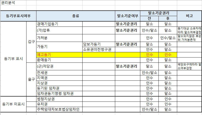 그동안제가 공부한 내용 정리한 표는 다음과 같습니다. 이표만 달달 외우면 권리분석이 쉬워집니다!!