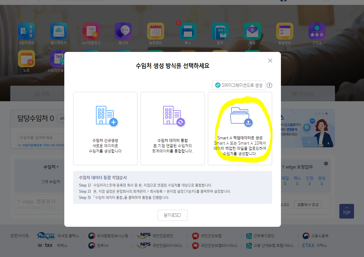 1) 세무대리인은 시작하기 화면에서 새수임처 등록을 클릭하여 [기존 SmartA 백업 데이터 생성]를 선택합니다.