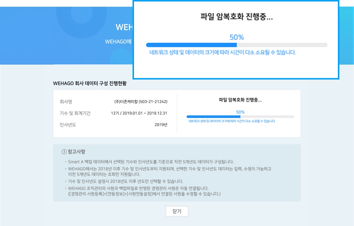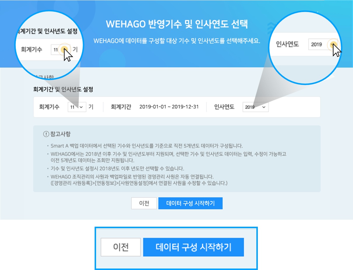 4). 회계기간 및 인사연도를 선택 후 [데이터 구성 시작하기] 버튼을 클릭하면 데이터 구성이 시작됩니다.
