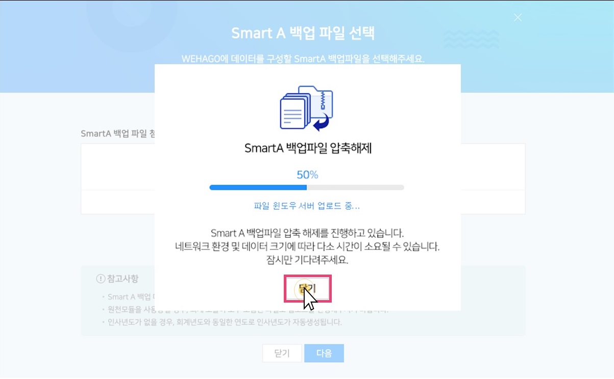 SmartA 데이터 업로드 하기 선택 후 [다음] 버튼 클릭 시 다음 단계로 이동할 수 있습니다.