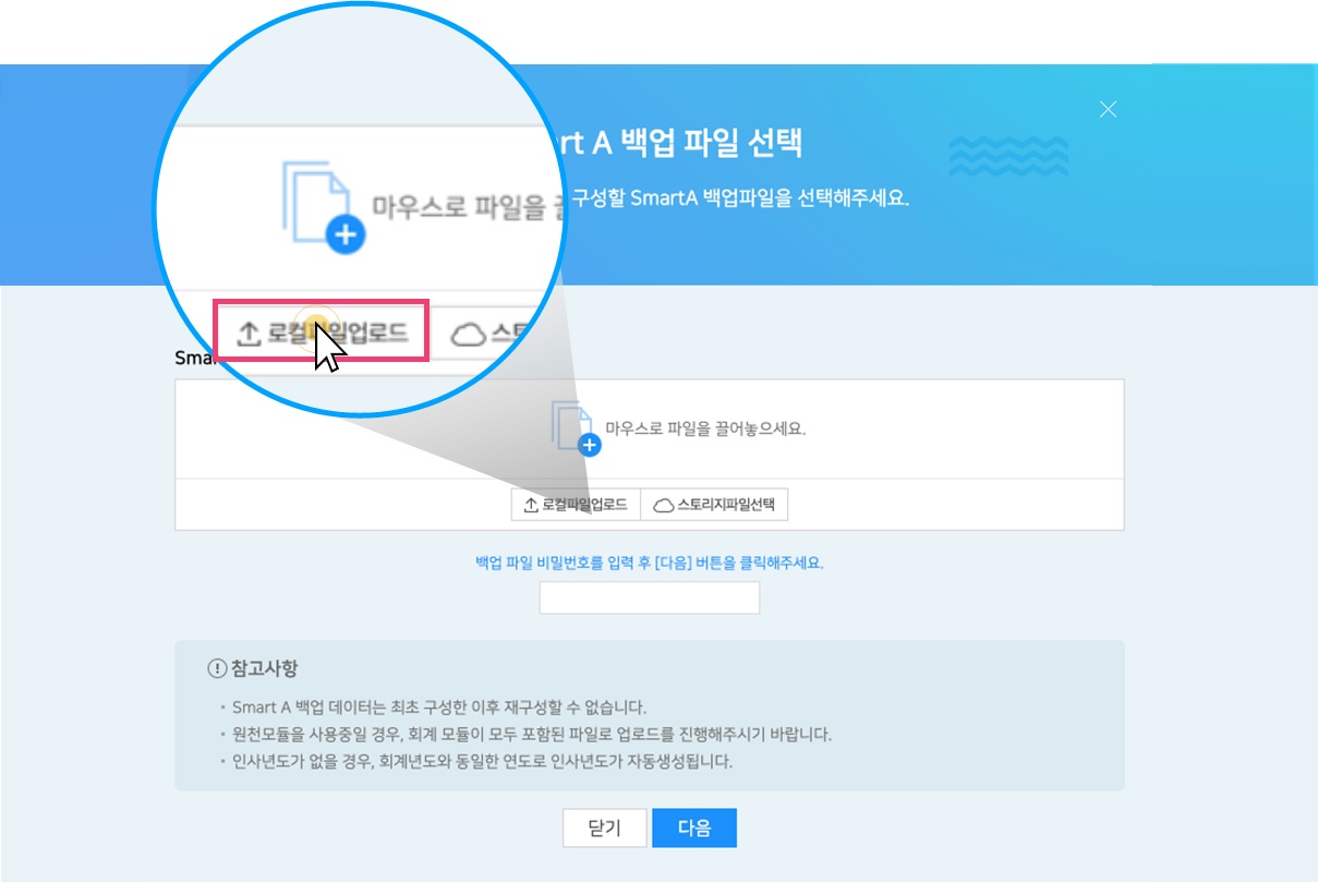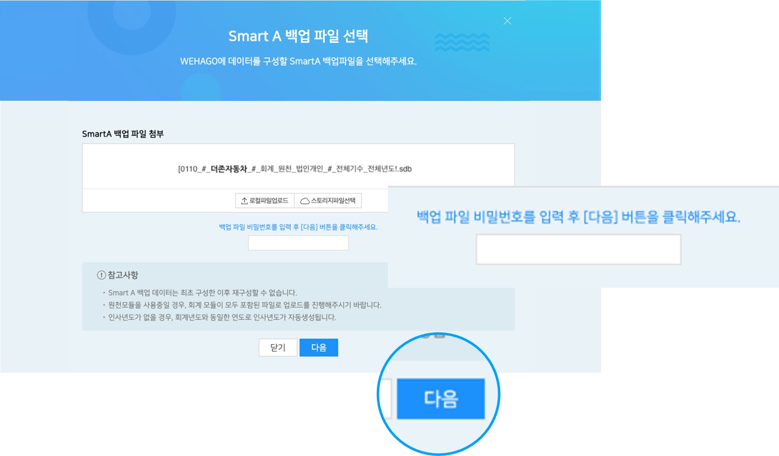 2). 업로드된 파일명을 확인 후 SmartA 백업 파일을 만들 시 설정한 비밀번호를 입력하고 다음 버튼을 클릭합니다.