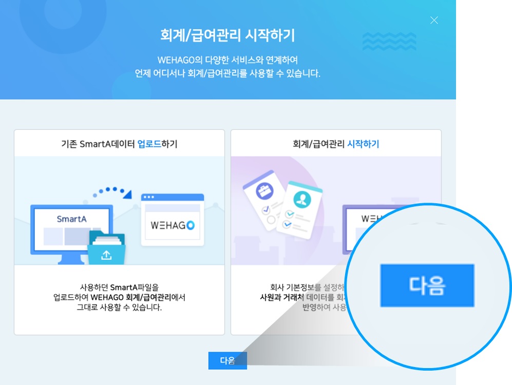 2) 일반회사 관리자(기업) 는 회계/ 급여관리 시작하기에서 [기존 SmartA 데이터 업로드 하기]를 선택합니다.