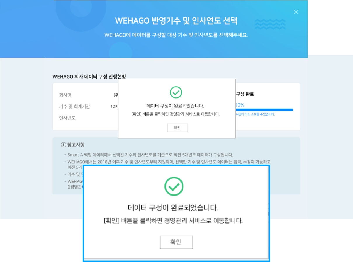 6). 데이터 구성 완료 팝업에서 [확인] 버튼을 클릭하시면 Smart A 10 서비스로 이동합니다.