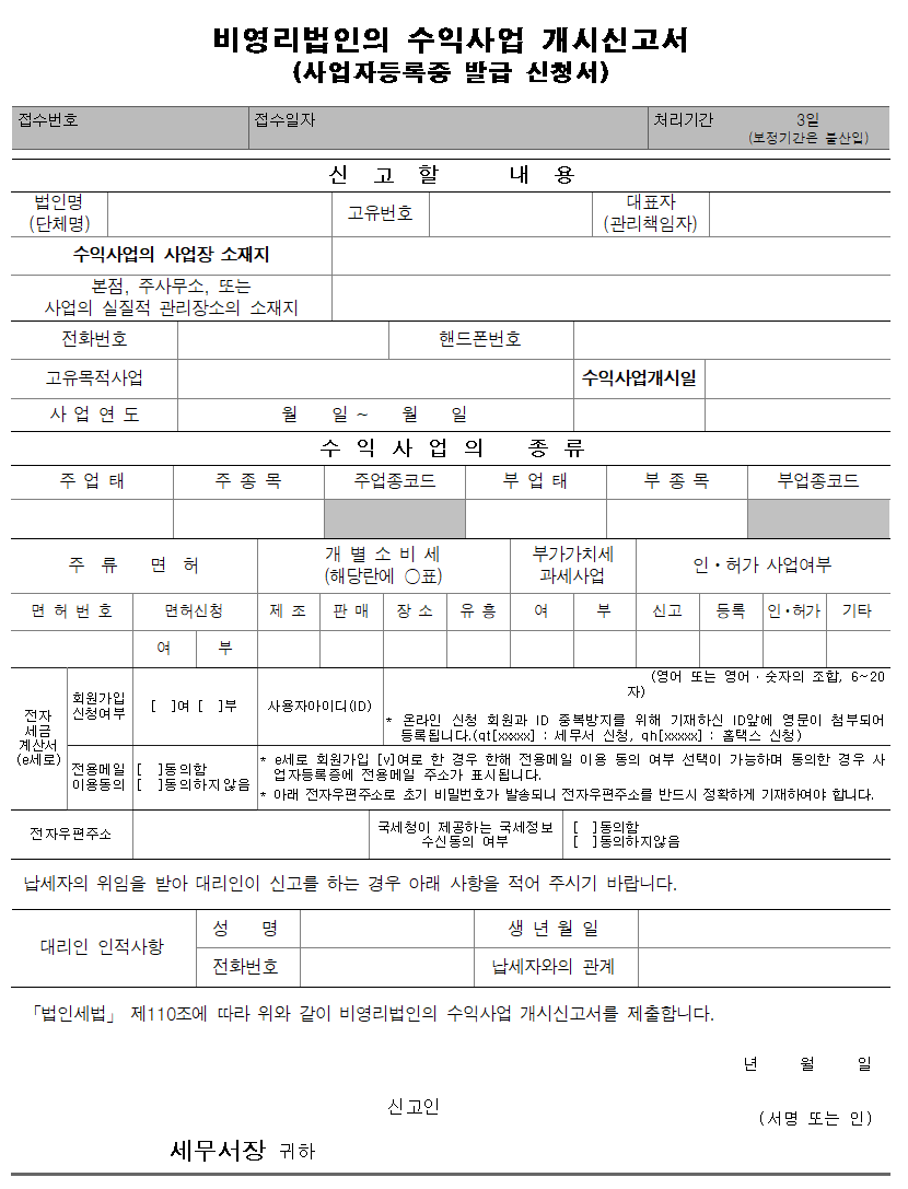 - 비영리법인 수익사업 개시신고서 (사업자등록 발급신청서및위임장) ; 단체 직인